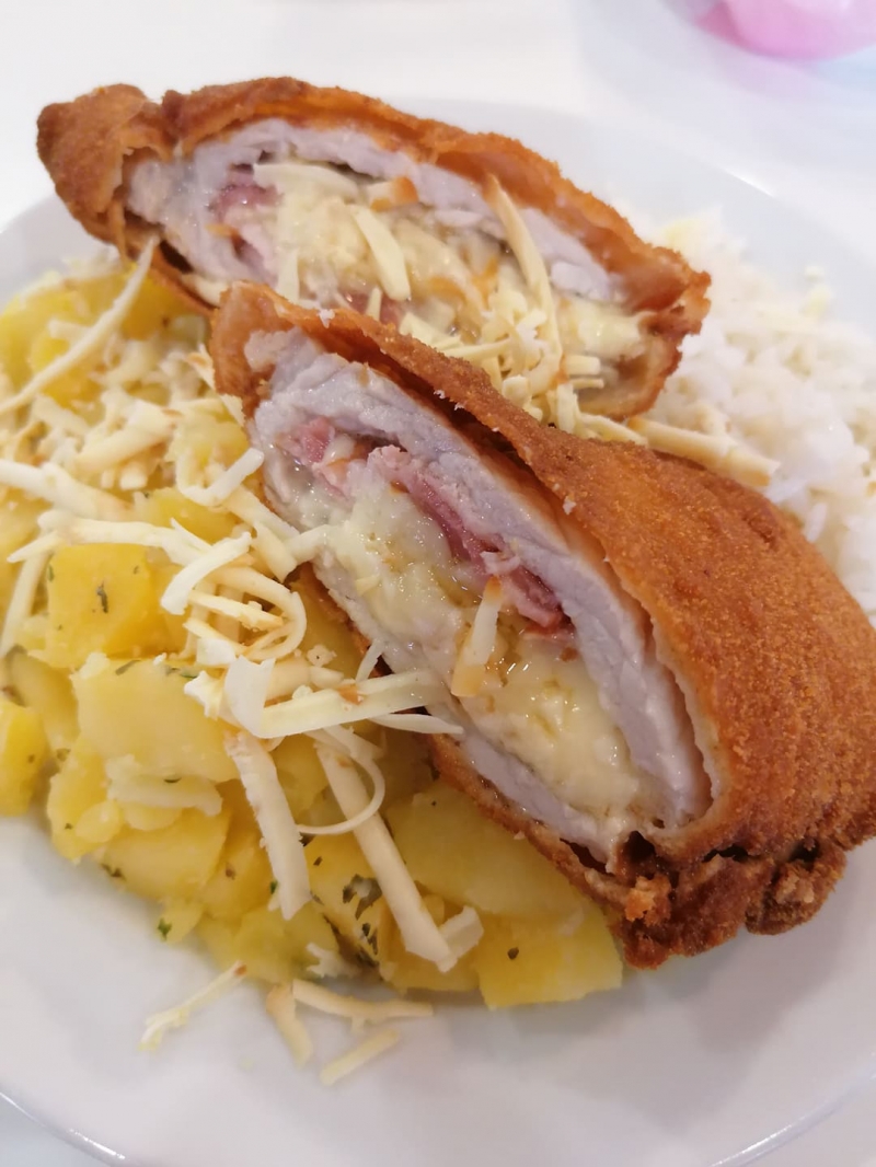 Füstölt sajttal és baconnel töltött rántott sertéskaraj, rizi-bizivel, savanyúsággal 2990 Ft