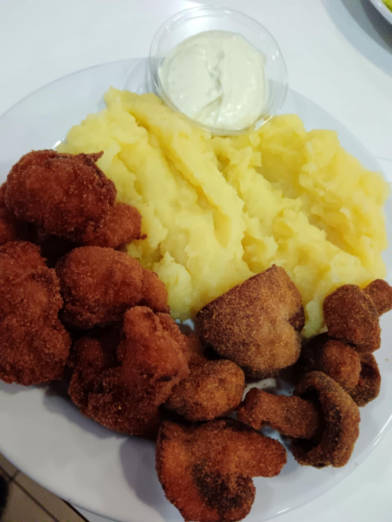 Rántott gomba és karfiol burgonyapürével és tartárral 2490 Ft