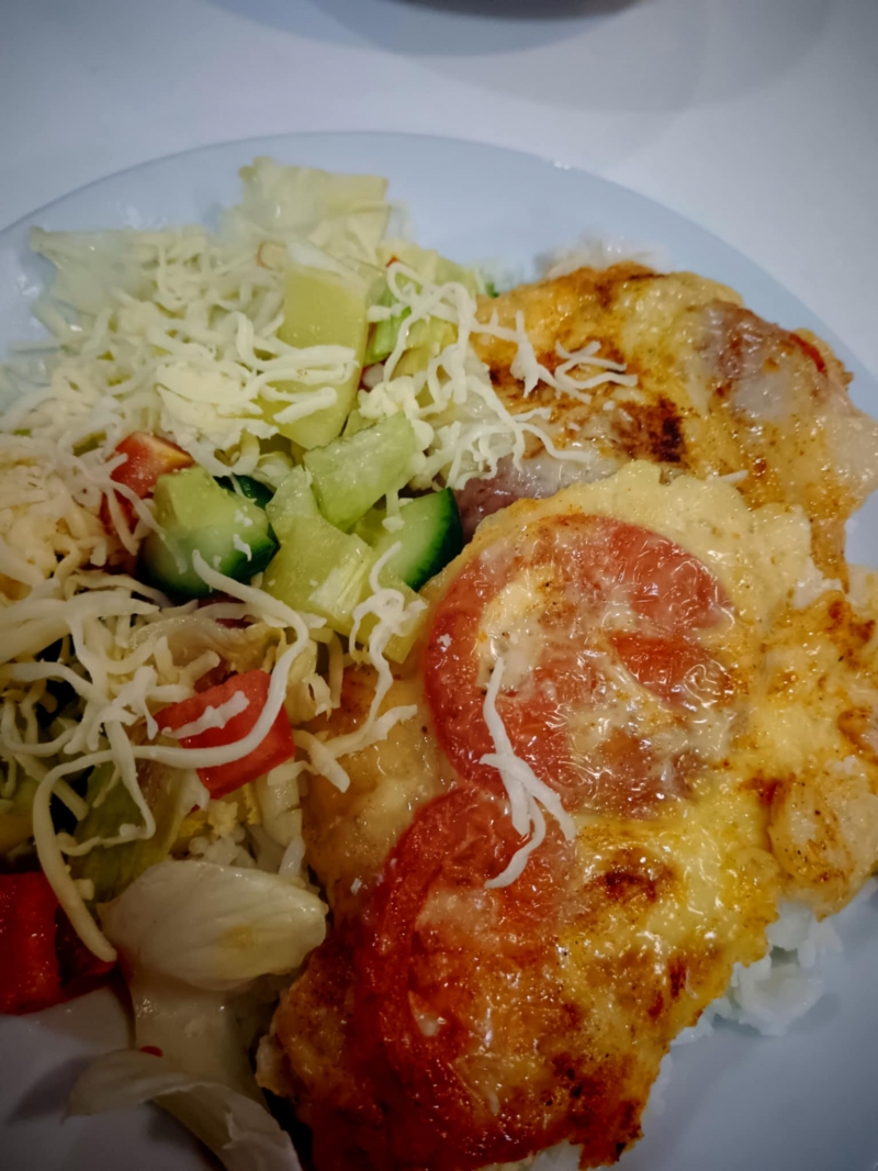 Camamberttel és paprikával sült csirkecombfilé, bulgurral, és zöldsalátával