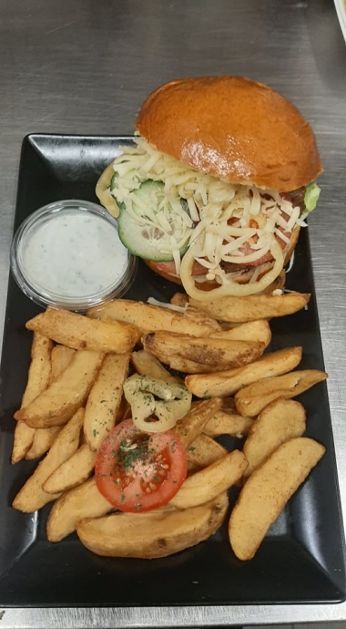 Házi marhahúsos hamburger hasábburgonyával és mártogatóssal 2990 Ft